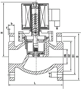 本閥為分步動作直接先導式電磁閥,可根據(jù)斷電時所處開、關狀態(tài)的不同,可分為常閉式電磁閥和常開式電磁閥。常閉電磁閥,線圈通電后,銜鐵在電磁力作用下先帶動副閥閥塞提起,主閥閥杯上的流體經(jīng)副閥流走,減少了作用在主閥閥杯上的壓力,當主閥閥杯上的壓力減少到一定值時,銜鐵帶動主閥閥杯,并利用壓差而使主閥閥杯開啟,介質(zhì)流通。線圈斷電后,電磁力消失,銜鐵因自重下落復位。同時依靠介質(zhì)壓力,主副閥得以緊密關閉。常開電磁閥,線圈通電后由于吸力作用,動鐵芯下移,把副閥閥塞壓下,副閥關閉,主閥閥杯內(nèi)壓力上升,當壓力升到一定值時,主閥閥杯的上下壓差一樣,由于電磁力作用,動鐵芯推動主閥閥杯下,壓緊主閥閥座,閥門關閉。線圈斷電時,電磁吸力為零,副閥閥塞和動鐵芯由于彈簧作用向上提起,副閥打開,主閥閥杯上的流體經(jīng)副閥流走,減少了作用在主閥閥杯上的壓力,當主閥閥杯上的壓力減少到一定值時,利用壓差把主閥閥杯推起,主閥打開,介質(zhì)流通