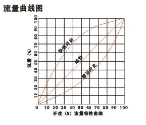 上圖為該種閥門的流量特性曲線,本廠生產(chǎn)的是其中等百分比特性閥門。從曲線圖上可知給開度一個相等的變化率,則流量的變化率相等,其特點是開度大時流量大,開度小時則流量小。而工程中大都在流量大時應(yīng)用,等百分比閥門恰恰適用這個要求。根據(jù)這一特點,可以自如的予置某更高量(快開閥門和線性閥門則不具備這種功能)而且當(dāng)需要變化時,還能知道變化量,達(dá)到理想狀態(tài)。