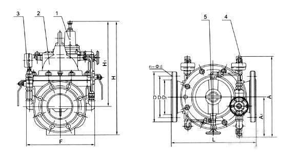 1, pilot valve 2, main valve 3, ball valve 4, pressure gauge 5, needle table.