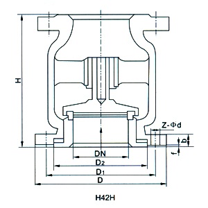 H42H、H42W立式止回閥正常處于關閉狀態(tài),由于管線中進口端介質的壓力作用,而克服彈簧阻力使閥門開啟。當進口端介質壓力低于出口端時,彈簧將閥芯推向閥座而使閥門關閉,阻止介質逆流,故起止回作用。
